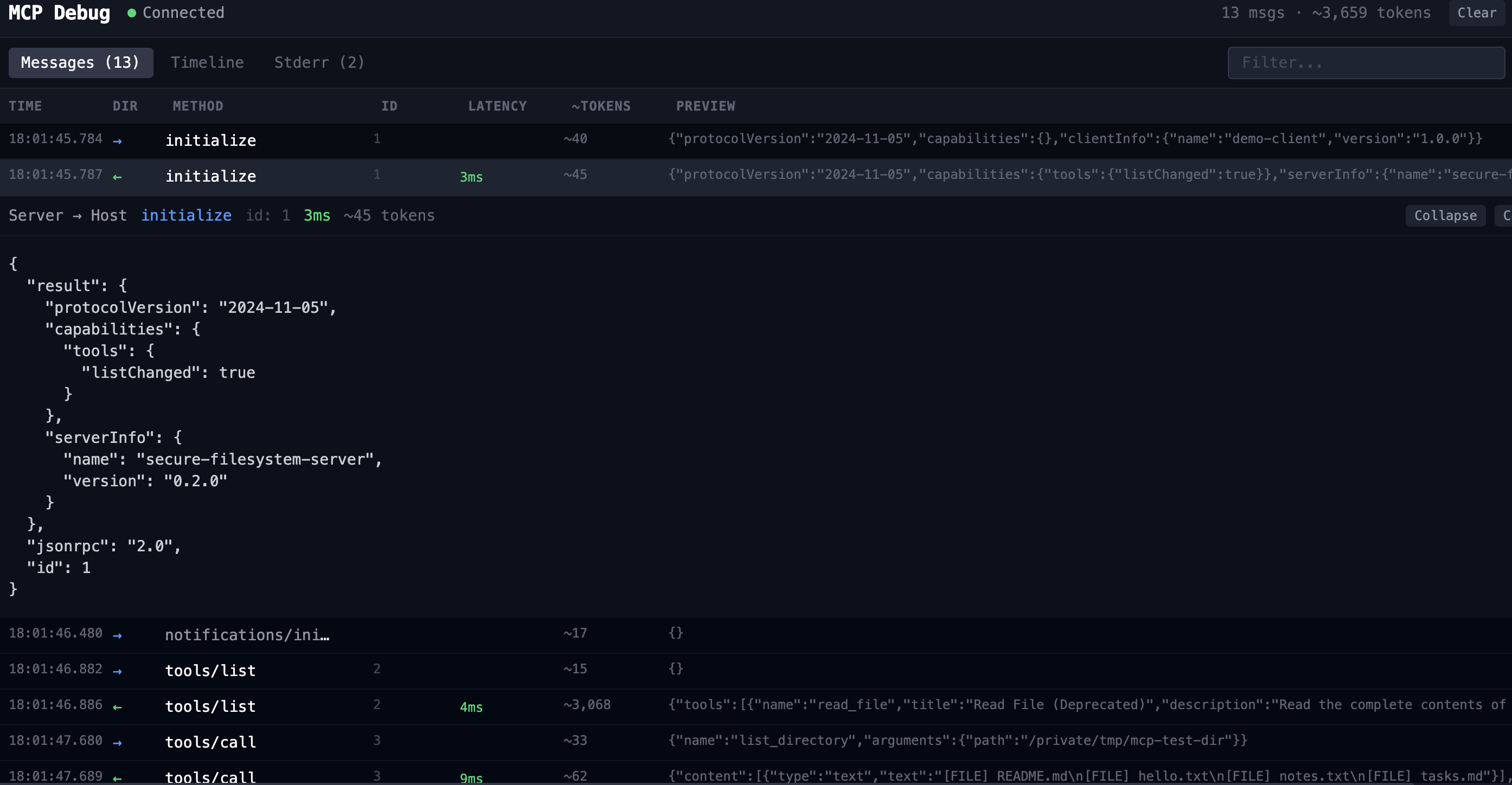 The simplest way to see mcp-debug in action. Uses mcp-server-filesystem to list a local directory — one tool call, a clean response, and the full initialize handshake visible from the start.