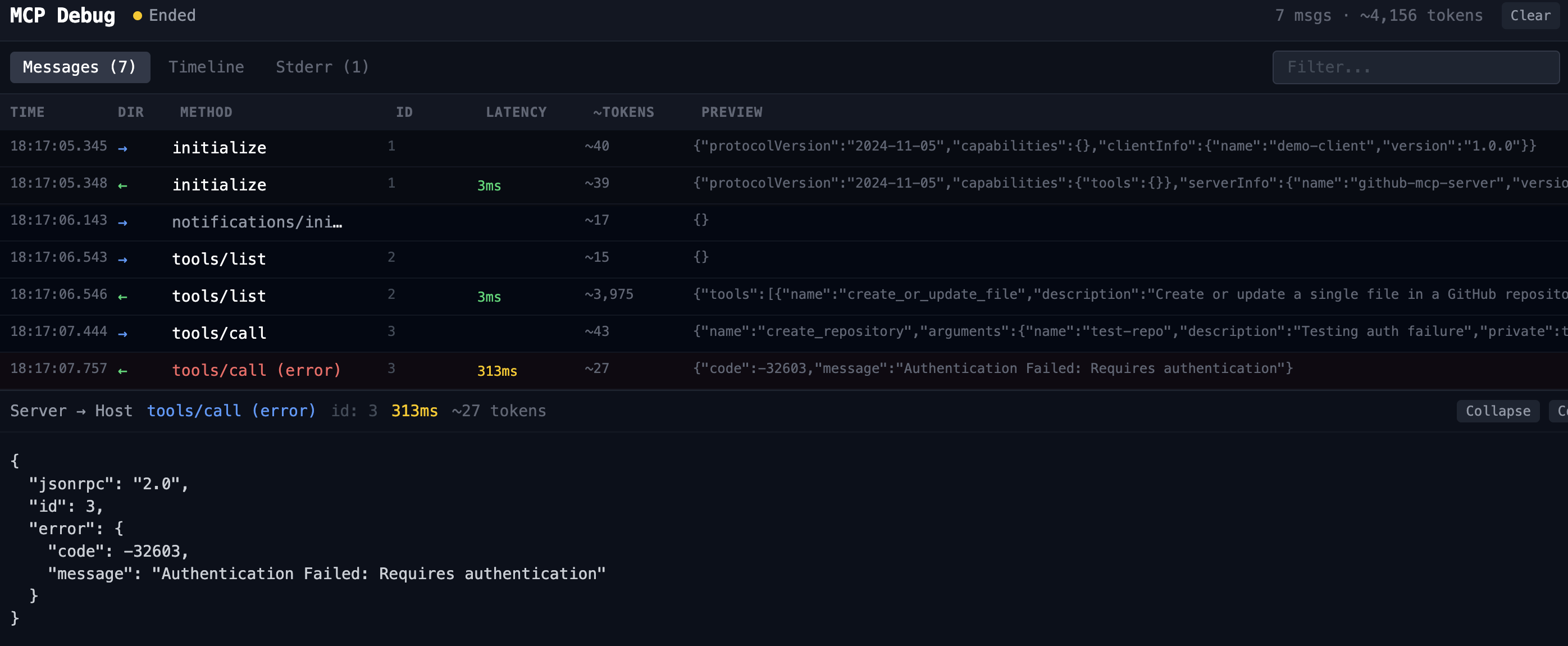 When a server rejects a request, the error is often swallowed by the client and surfaces as a vague failure. mcp-debug shows the full JSON-RPC error envelope so you can see exactly what the server returned.